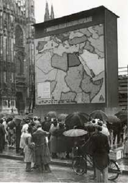 ST-ARCHIVIO ARGO PERIODO FASCISMO LOMBARDIA E MILANO NELLA FOTO L'ESPOSIZIONE DELLA GRANDE CARTA GEOGRAFICA CHE IL MINISTERO DELLA CULTURA POPOLARE E IL COMUNE DI MILAN HA COLLOCATO SUL SAGRATO DEL DUOMO CHE VERRA' AGGIORNATO DURANTE LE OPERAZIONI DI GUERRA FOTO ARGO-PROV ARCH CONTROLUCE-AG ALDO LIVERANI SAS
