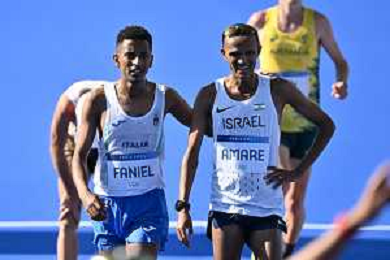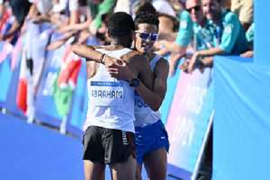 Olimpiadi Parigi 2024 - Atletica nella foto Eyob Faniel (ITA) a SX termina la sua gara Parigi (FRA) 10-08-2024 Invalides Atletica Leggera Maratona maschile foto Roberto Garavaglia/Agenzia Aldo Liverani sas
