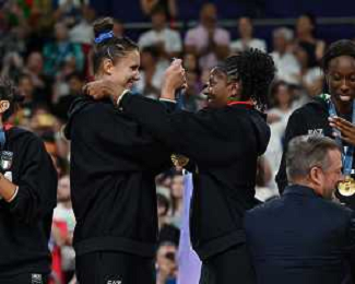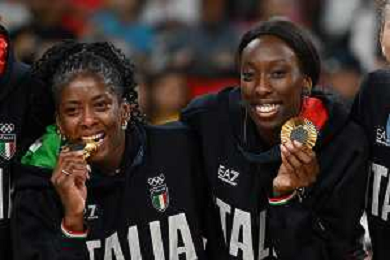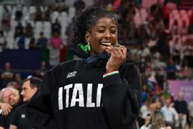 Olimpiadi Parigi 2024 - Pallavolo nella foto Anna Danesi (Italia) SX e Miriam Fatime Sylla (Italia) DX si scambiano la medaglia Parigi (FRA) 11-08-2024 Arena Parigi Sud Pallavolo femminile - Finale per la medaglia d'oro Stati Uniti vs Italia foto Roberto Garavaglia/Agenzia Aldo Liverani sas