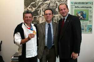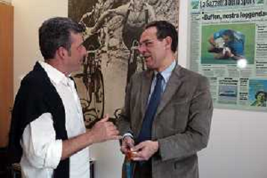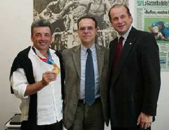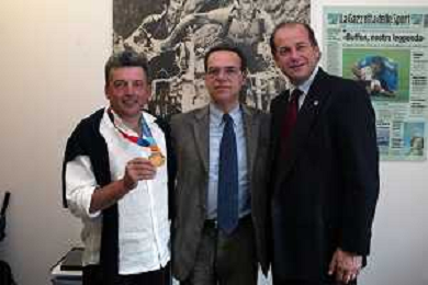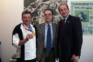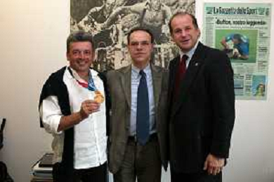 Milano 2 Maggio 2005 forum in redazione della gazzetta dello sport con Luciano Rossi presidente federazione tiro a volo e Andrea Benelli medaglia d'oro olimpiaca Atene 2004 NELLA FOTO ANTONIO DI ROSA DIRETTORE DELLA GAZZETTA DELLO SPORT CON ANDREA BENELLI foto Andry / Ag. Aldo Liverani