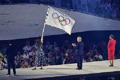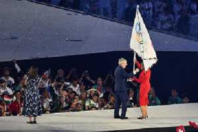 Olimpiadi Parigi 2024 - Cerimonia chiusura nella foto il passaggio della bandiera olimpica dalla città di Parigi alla città di Los Angeles Parigi (FRA) 11-08-2024 Stade de France La cerimonia di chiusura delle Olimpiadi di Parigi 2024 foto Roberto Garavaglia/Agenzia Aldo Liverani sas