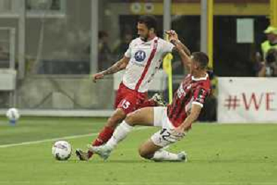 Davide Calabria of AC Milan competes for the ball with Andrea Carboni of AC Monza during AC Milan vs AC Monza , 2° edition of "Trofeo Berlusconi", frendly match pre-season, at Giuseppe Meazza - San Siro stadium of Milano (MI), Italy, on August 13, 2024. (Photo by Davide Casentini)/ AGENZIA ALDO LIVERANI SAS