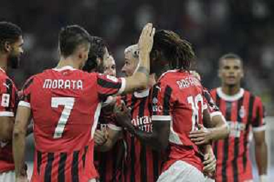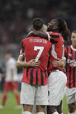 Alexis Saelemaekers of AC Milan celebrates with Alvaro Morata of AC Milan during AC Milan vs AC Monza , 2° edition of "Trofeo Berlusconi", frendly match pre-season, at Giuseppe Meazza - San Siro stadium of Milano (MI), Italy, on August 13, 2024. (Photo by Davide Casentini)/ AGENZIA ALDO LIVERANI SAS
