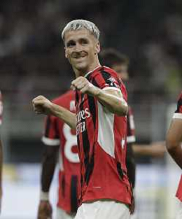 Alexis Saelemaekers of AC Milan celebrates after scoring during AC Milan vs AC Monza , 2° edition of "Trofeo Berlusconi", frendly match pre-season, at Giuseppe Meazza - San Siro stadium of Milano (MI), Italy, on August 13, 2024. (Photo by Davide Casentini)/ AGENZIA ALDO LIVERANI SAS