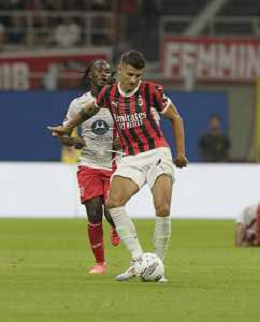 Tommaso Pobega of AC Milan play the ball during AC Milan vs AC Monza , 2° edition of "Trofeo Berlusconi", frendly match pre-season, at Giuseppe Meazza - San Siro stadium of Milano (MI), Italy, on August 13, 2024. (Photo by Davide Casentini)/ AGENZIA ALDO LIVERANI SAS