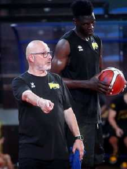 IMOLA 16 08 2024 VIRTUS IMOLA BASKET SERIE B1 PRIMO ALLENAMENTO NELLA FOTO GIAN LUIGI GALETTI ALLENATORE CON SERAPHIN KADJIVIDI ©SANNA/AGENZIA ALDO LIVERANI SAS