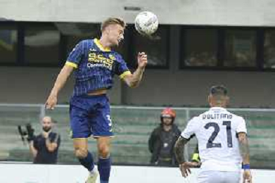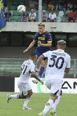 Martin Frese of Hellas Verona FC heads the ball during Hellas Verona FC vs SSC Napoli, 1° Serie A EniLive 2024-25 game at Marcantonio Bentegodi Stadium in Verona (VR), Italy, on August 18, 2024. (Photo by Davide Casentini)/AGENZIA ALDO LIVERANI SAS