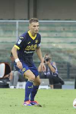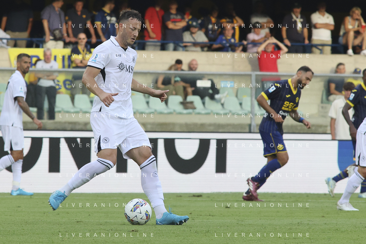 Pawel Dawidowicz of Hellas Verona FC play the ball during Hellas Verona FC vs SSC Napoli, 1° Serie A EniLive 2024-25 game at Marcantonio Bentegodi Stadium in Verona (VR), Italy, on August 18, 2024. (Photo by Davide Casentini)/AGENZIA ALDO LIVERANI SAS