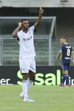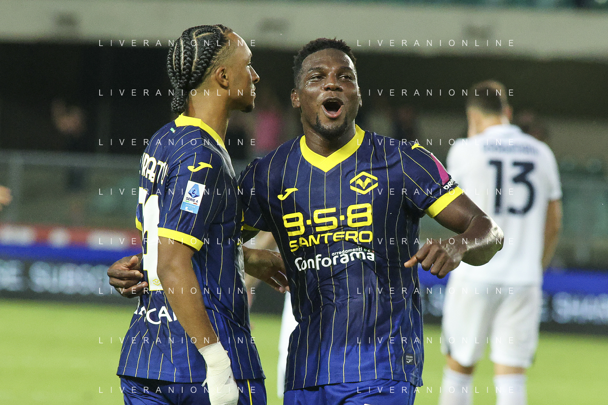 Daniel Mosquera of Hellas Verona FC celebrates after scoring second goal during Hellas Verona FC vs SSC Napoli, 1° Serie A EniLive 2024-25 game at Marcantonio Bentegodi Stadium in Verona (VR), Italy, on August 18, 2024. (Photo by Davide Casentini)/AGENZIA ALDO LIVERANI SAS