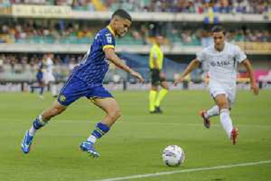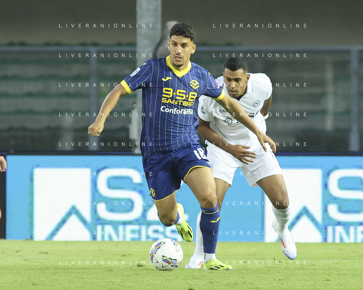 Abdou Harroui of Hellas Verona FC play the ball during Hellas Verona FC vs SSC Napoli, 1° Serie A EniLive 2024-25 game at Marcantonio Bentegodi Stadium in Verona (VR), Italy, on August 18, 2024. (Photo by Davide Casentini)/AGENZIA ALDO LIVERANI SAS
