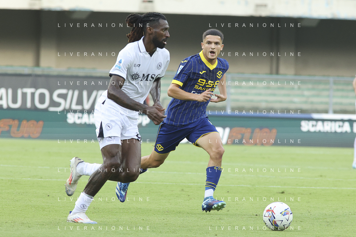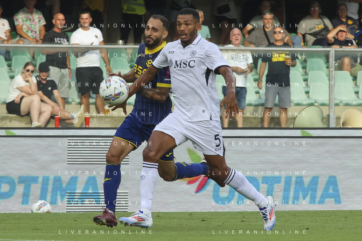 Jackson Tchatchoua of Hellas Verona FC battle for the ball with Leonardo Spinazzola of SSC Napoli during Hellas Verona FC vs SSC Napoli, 1° Serie A EniLive 2024-25 game at Marcantonio Bentegodi Stadium in Verona (VR), Italy, on August 18, 2024. (Photo by Davide Casentini)/AGENZIA ALDO LIVERANI SAS