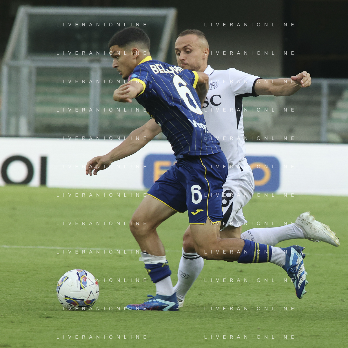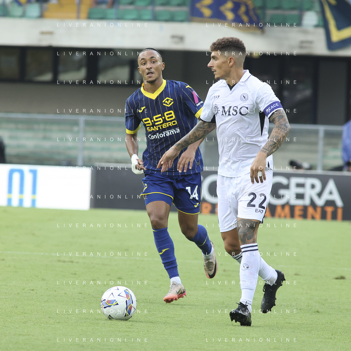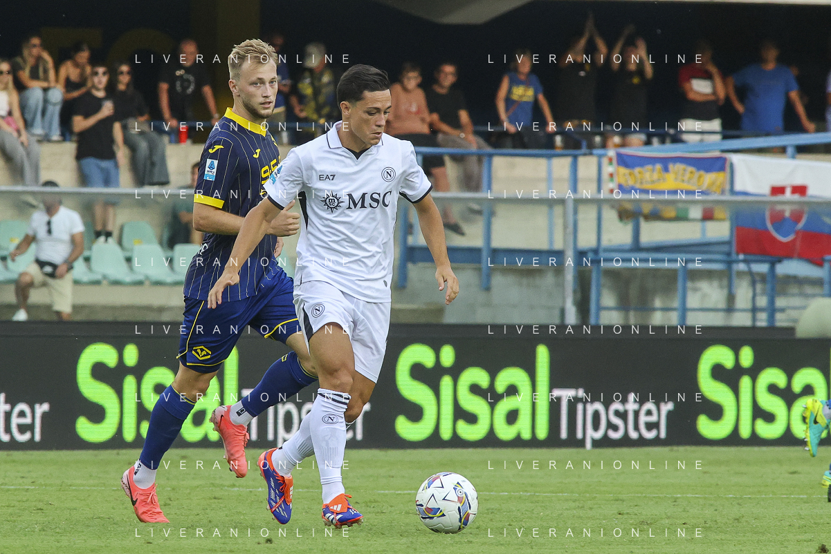 Martin Frese of Hellas Verona FC battle for the ball with Matteo Politano of SSC Napoli during Hellas Verona FC vs SSC Napoli, 1° Serie A EniLive 2024-25 game at Marcantonio Bentegodi Stadium in Verona (VR), Italy, on August 18, 2024. (Photo by Davide Casentini)/AGENZIA ALDO LIVERANI SAS