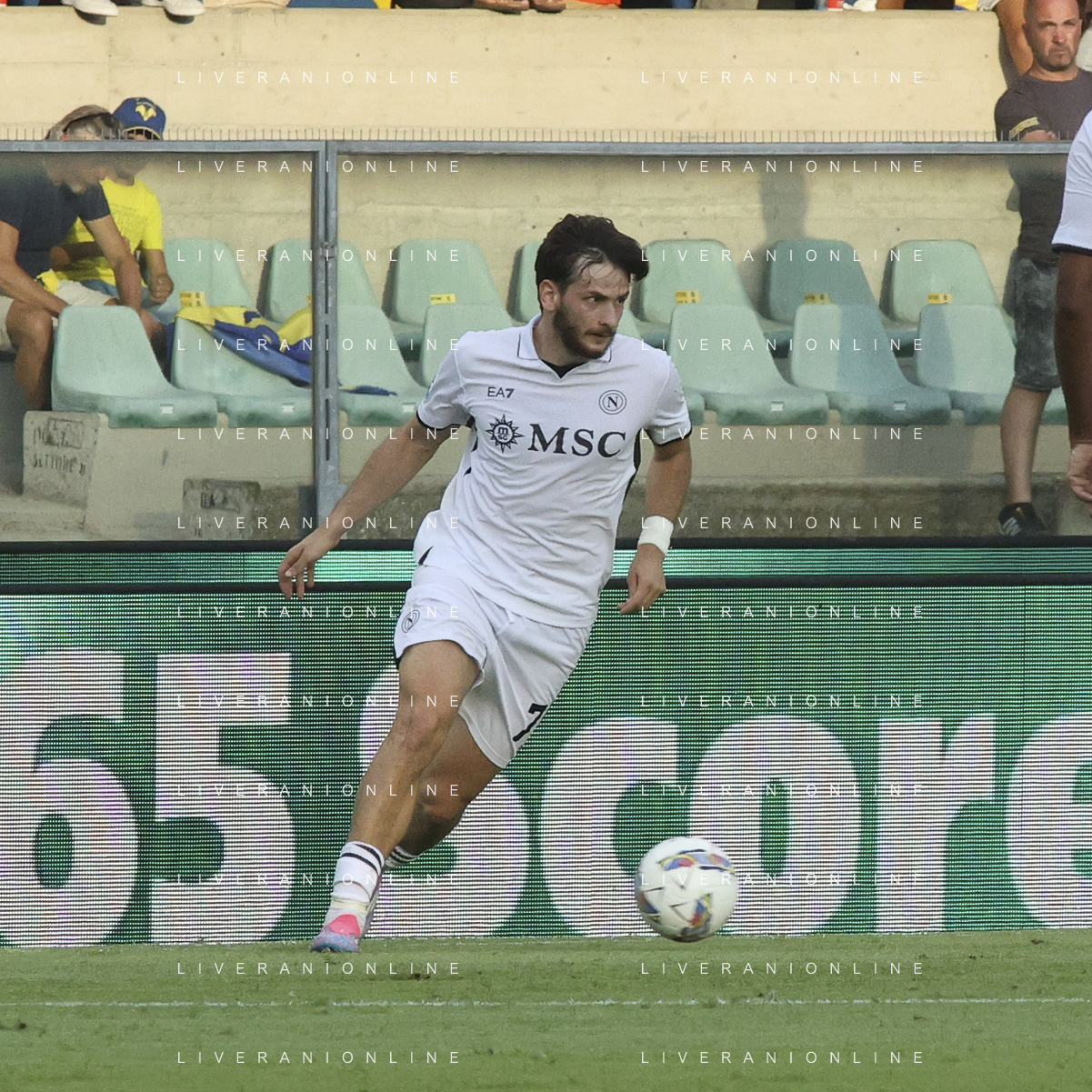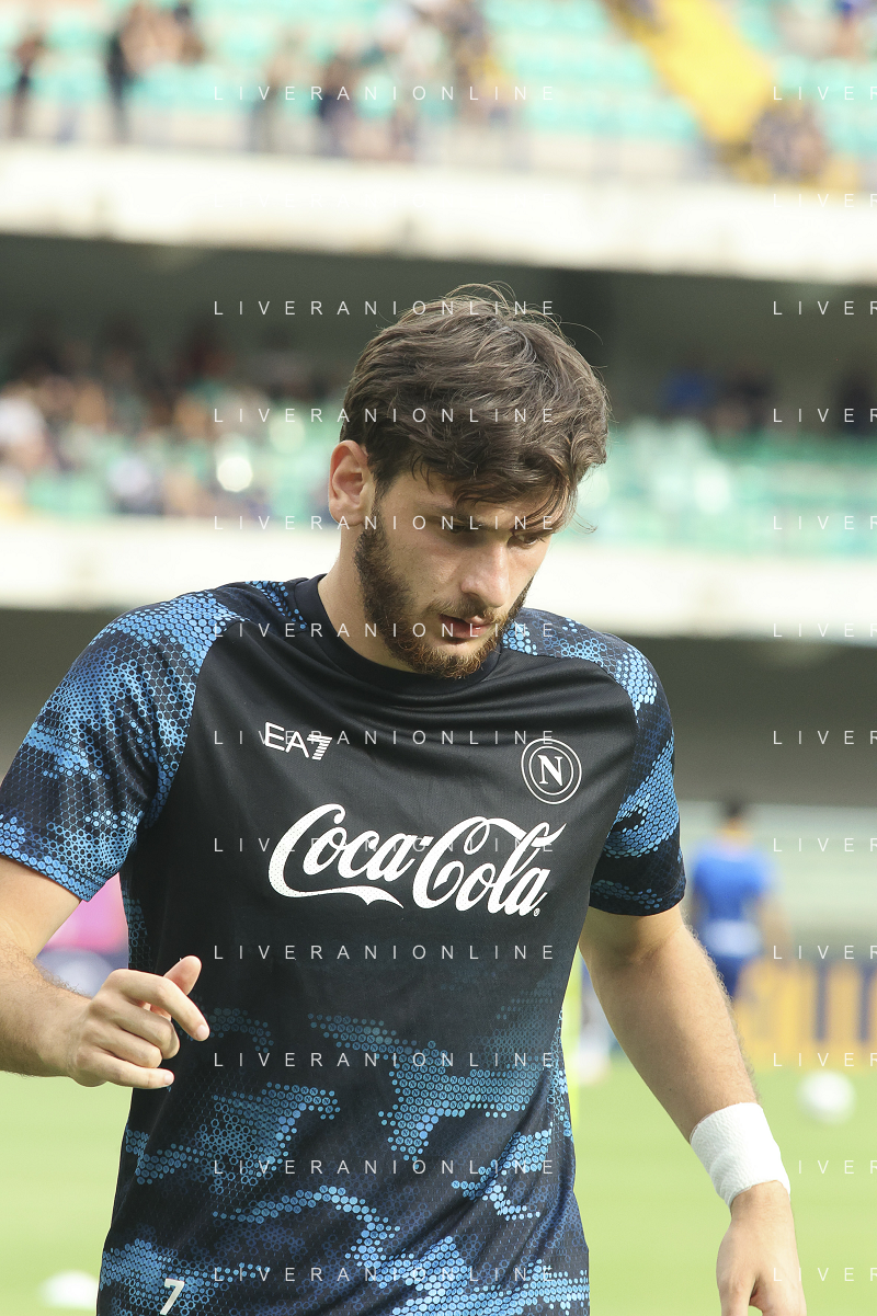 Khvicha Kvaratskhelia of SSC Napoli during Hellas Verona FC vs SSC Napoli, 1° Serie A EniLive 2024-25 game at Marcantonio Bentegodi Stadium in Verona (VR), Italy, on August 18, 2024. (Photo by Davide Casentini)/AGENZIA ALDO LIVERANI SAS