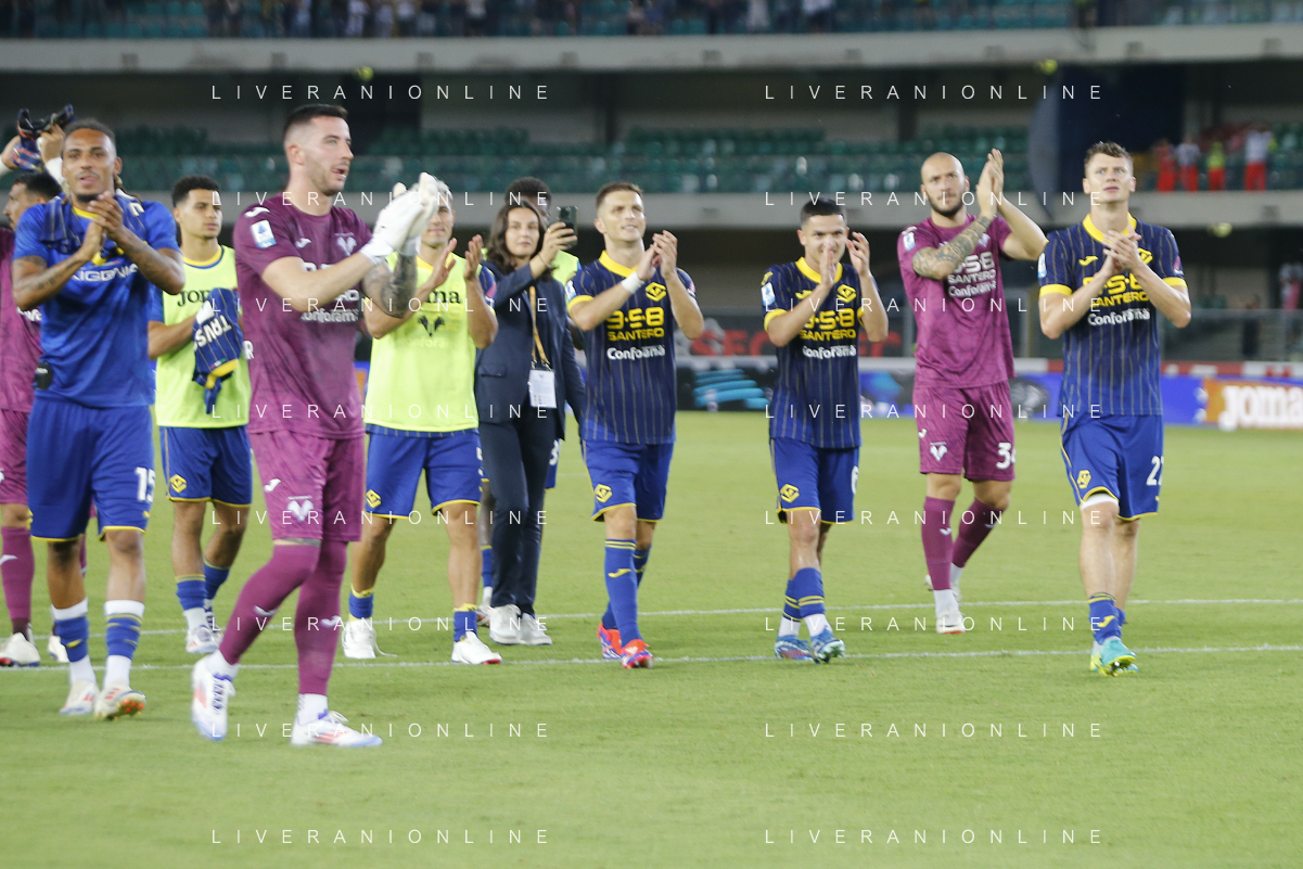 Hellas Verona players applaud the fans following the final whistle during Hellas Verona FC vs SSC Napoli, 1° Serie A EniLive 2024-25 game at Marcantonio Bentegodi Stadium in Verona (VR), Italy, on August 18, 2024. (Photo by Davide Casentini)/AGENZIA ALDO LIVERANI SAS