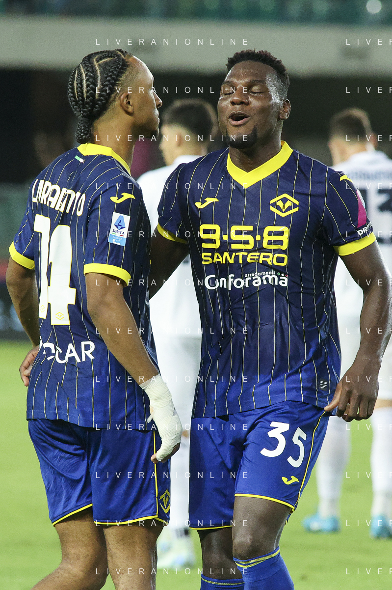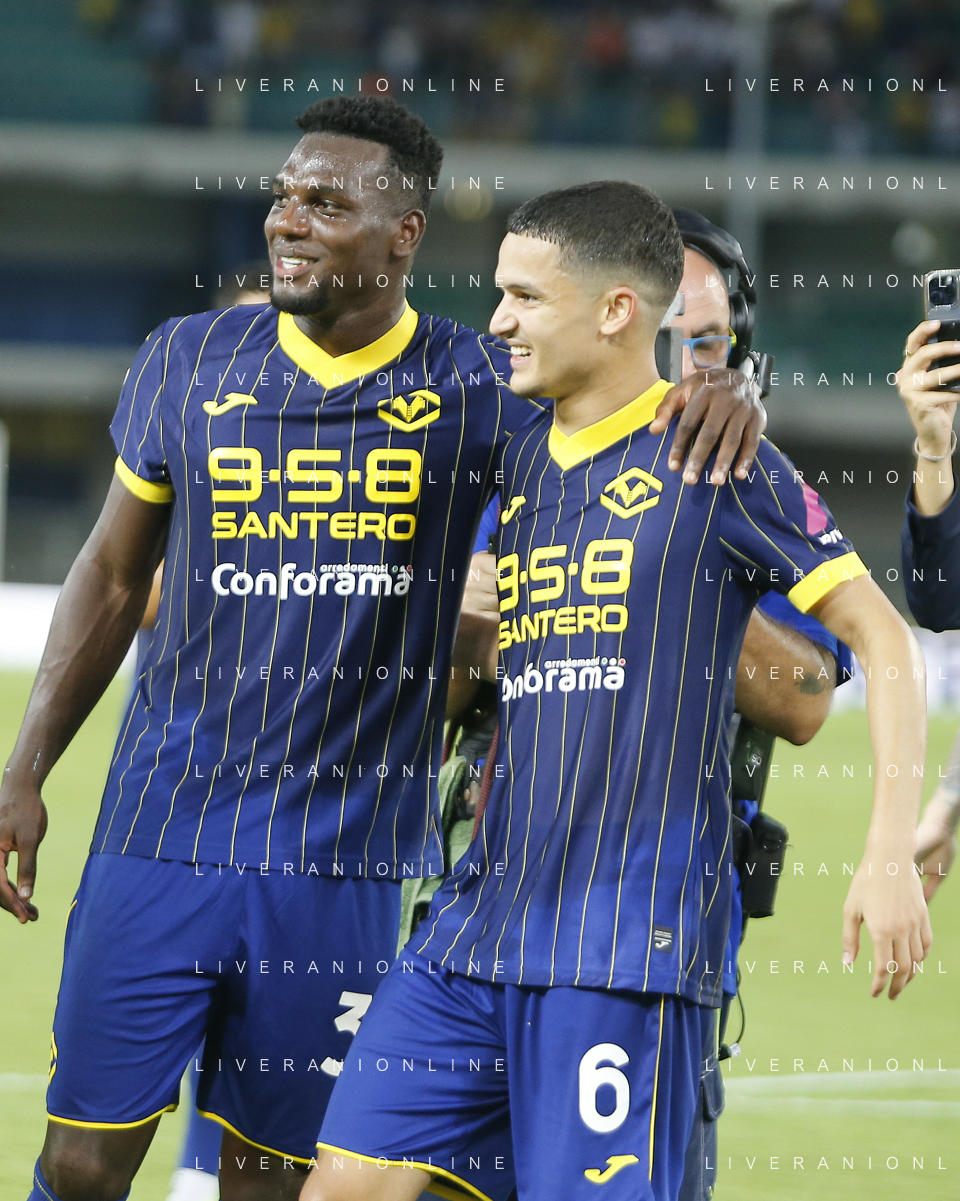 Daniel Mosquera of Hellas Verona FC and Dailon Livramento of Hellas Verona FC FC celebrate the victory at the end of Hellas Verona FC vs SSC Napoli, 1° Serie A EniLive 2024-25 game at Marcantonio Bentegodi Stadium in Verona (VR), Italy, on August 18, 2024. (Photo by Davide Casentini)/AGENZIA ALDO LIVERANI SAS