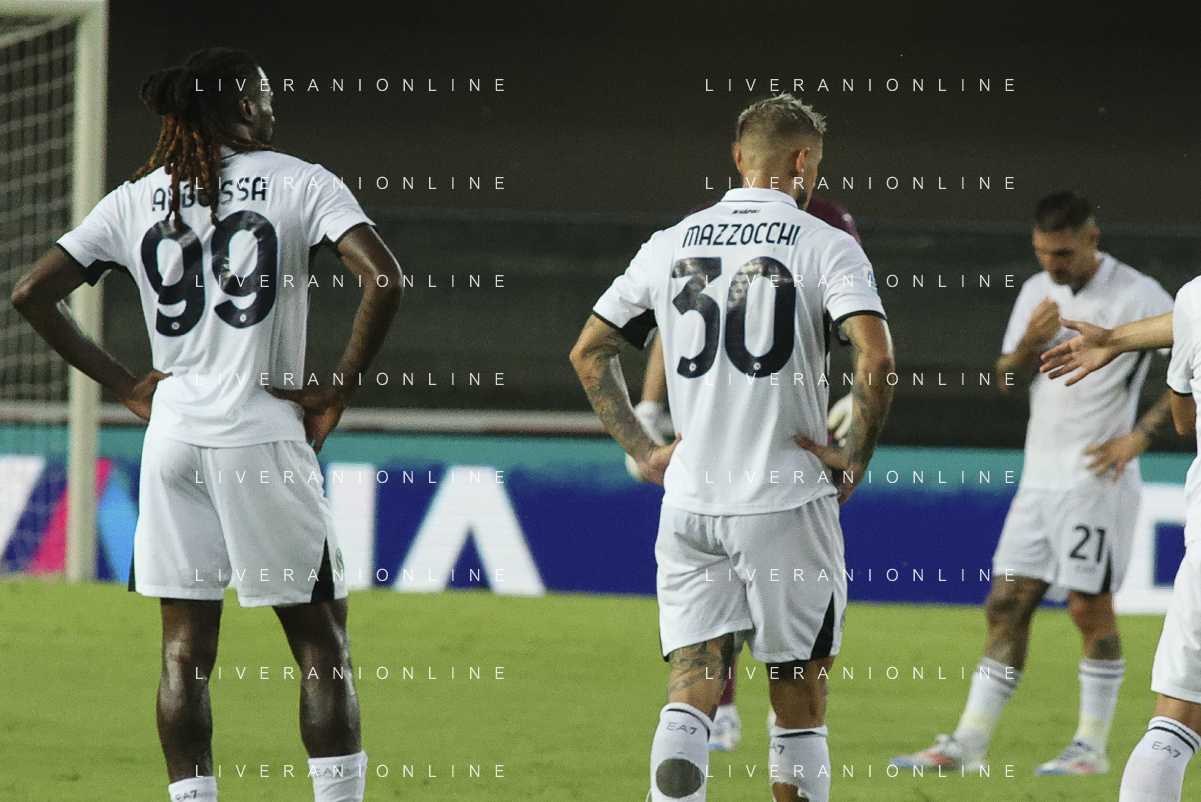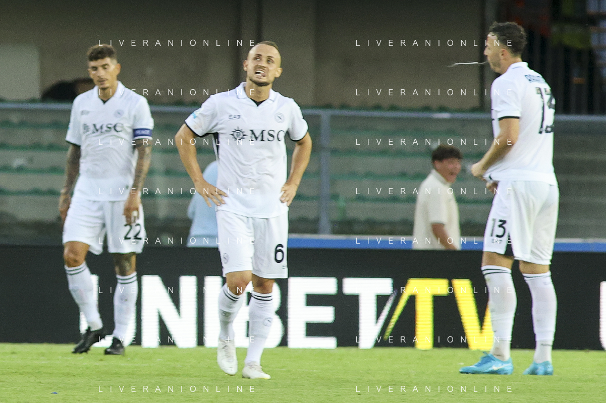 Andre'-Frank Zambo Anguissa of SSC Napoli and Pasquale Mazzocchi of SSC Napoli expresses disappointment at the end of Hellas Verona FC vs SSC Napoli, 1° Serie A EniLive 2024-25 game at Marcantonio Bentegodi Stadium in Verona (VR), Italy, on August 18, 2024. (Photo by Davide Casentini)/AGENZIA ALDO LIVERANI SAS