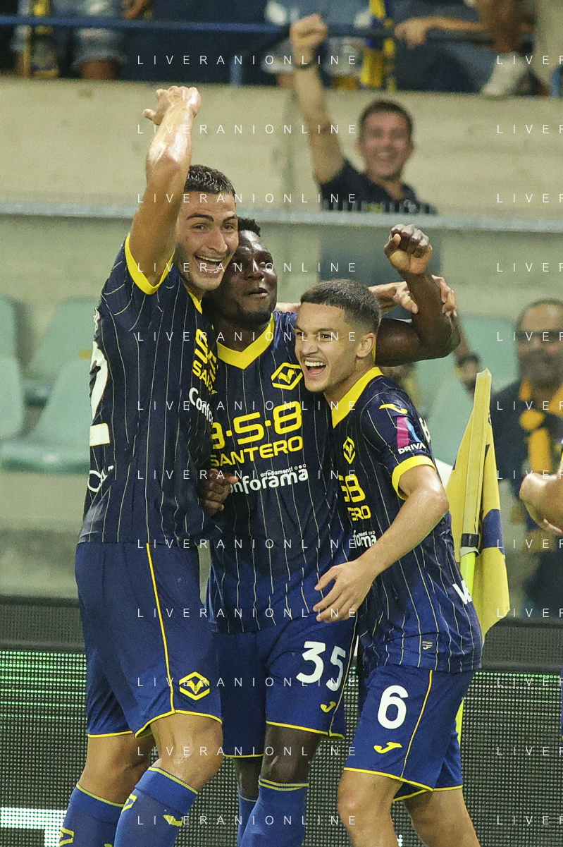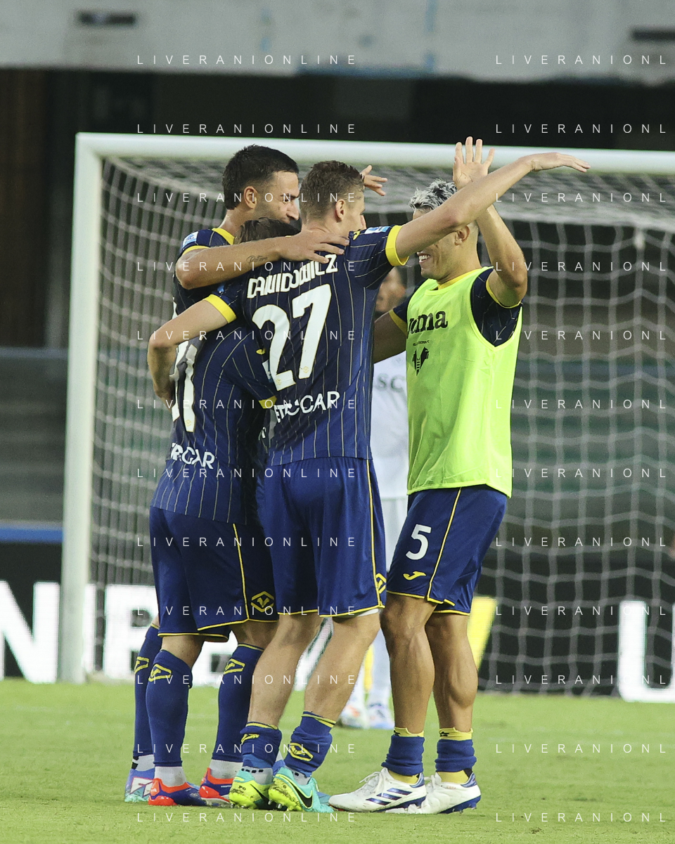 Esultanza - Hellas Verona players jubilates after scoring the goal during Hellas Verona FC vs SSC Napoli, 1° Serie A EniLive 2024-25 game at Marcantonio Bentegodi Stadium in Verona (VR), Italy, on August 18, 2024. (Photo by Davide Casentini)/AGENZIA ALDO LIVERANI SAS