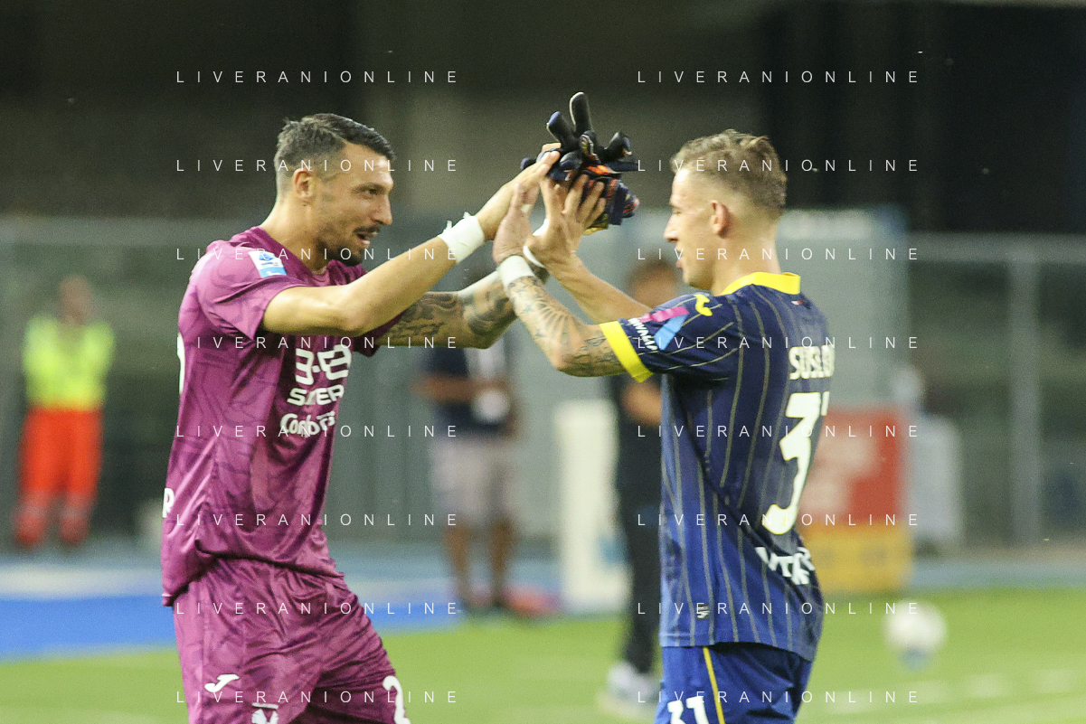 Alessandro Berardi of Hellas Verona FC and Tomas Suslov of Hellas Verona FC celebrate the victory at the end of Hellas Verona FC vs SSC Napoli, 1° Serie A EniLive 2024-25 game at Marcantonio Bentegodi Stadium in Verona (VR), Italy, on August 18, 2024. (Photo by Davide Casentini)/AGENZIA ALDO LIVERANI SAS
