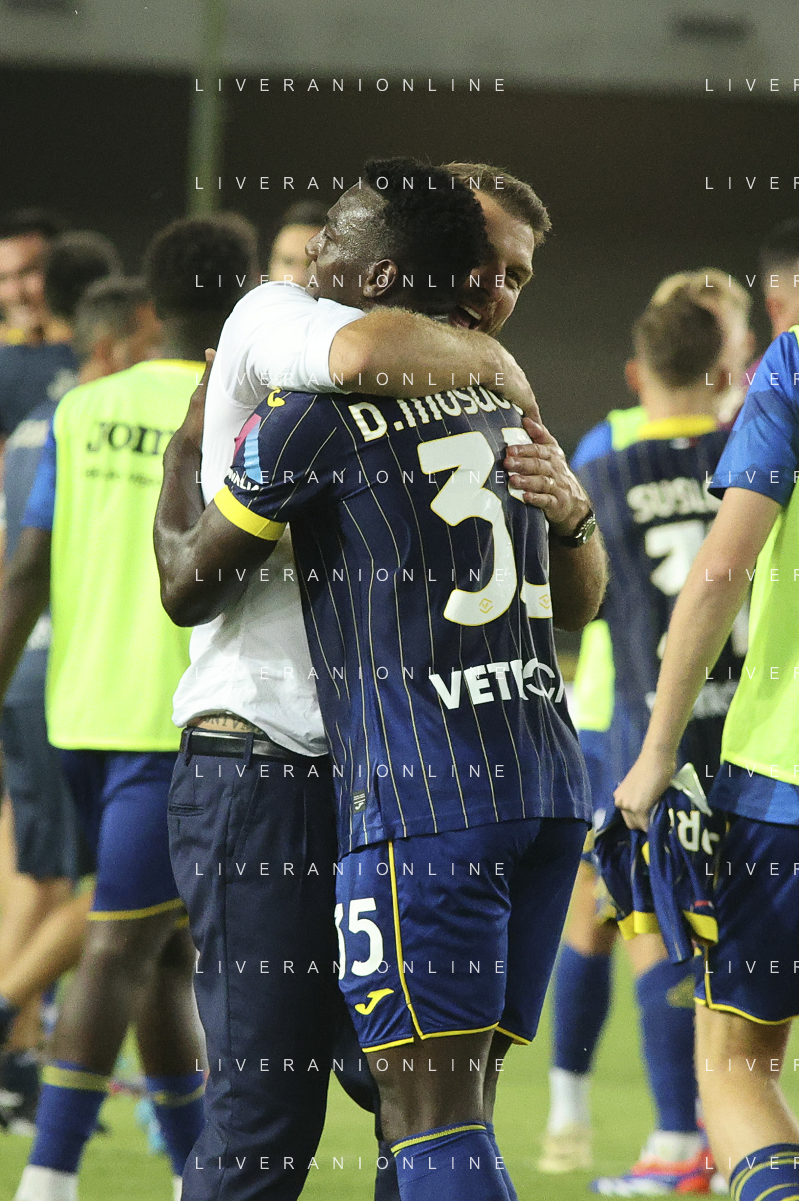 Paolo Zanetti Head Coach of Hellas Verona FC hugs Daniel Mosquera of Hellas Verona FC at the end of Hellas Verona FC vs SSC Napoli, 1° Serie A EniLive 2024-25 game at Marcantonio Bentegodi Stadium in Verona (VR), Italy, on August 18, 2024. (Photo by Davide Casentini)/AGENZIA ALDO LIVERANI SAS