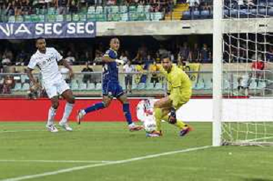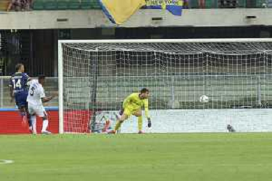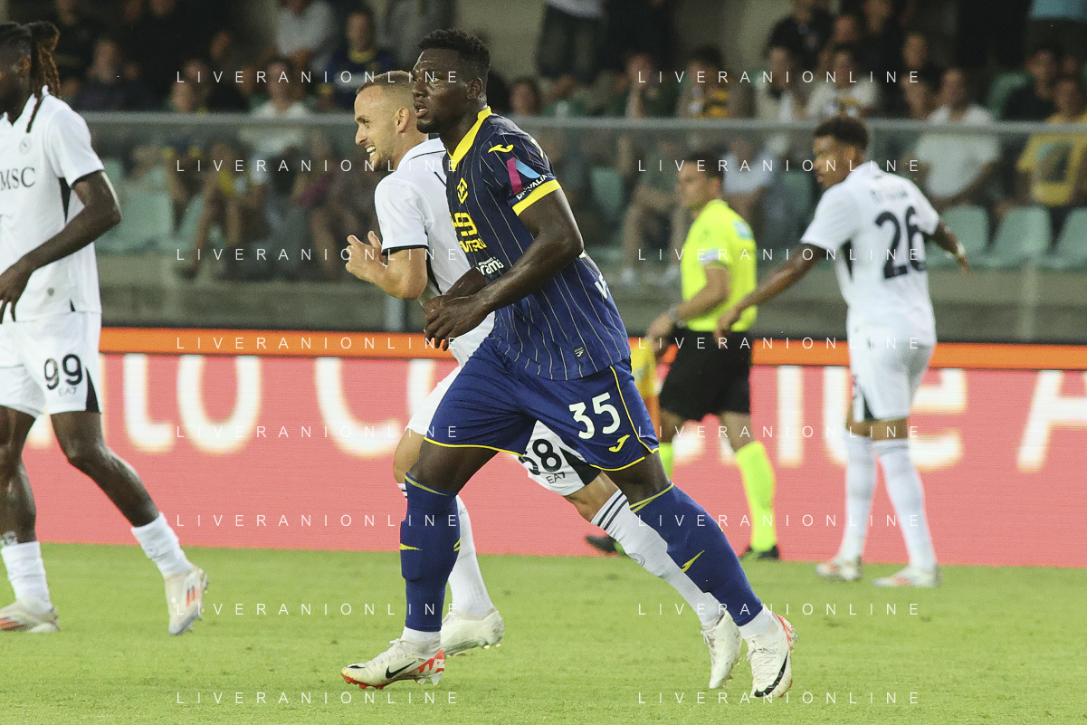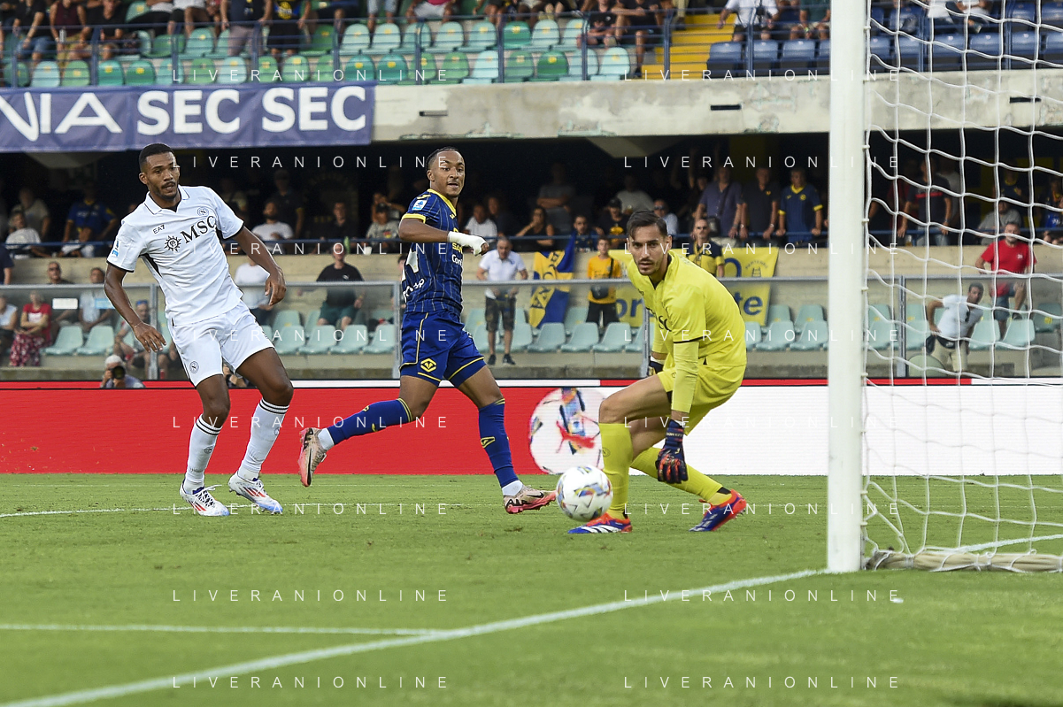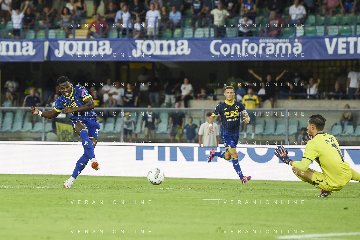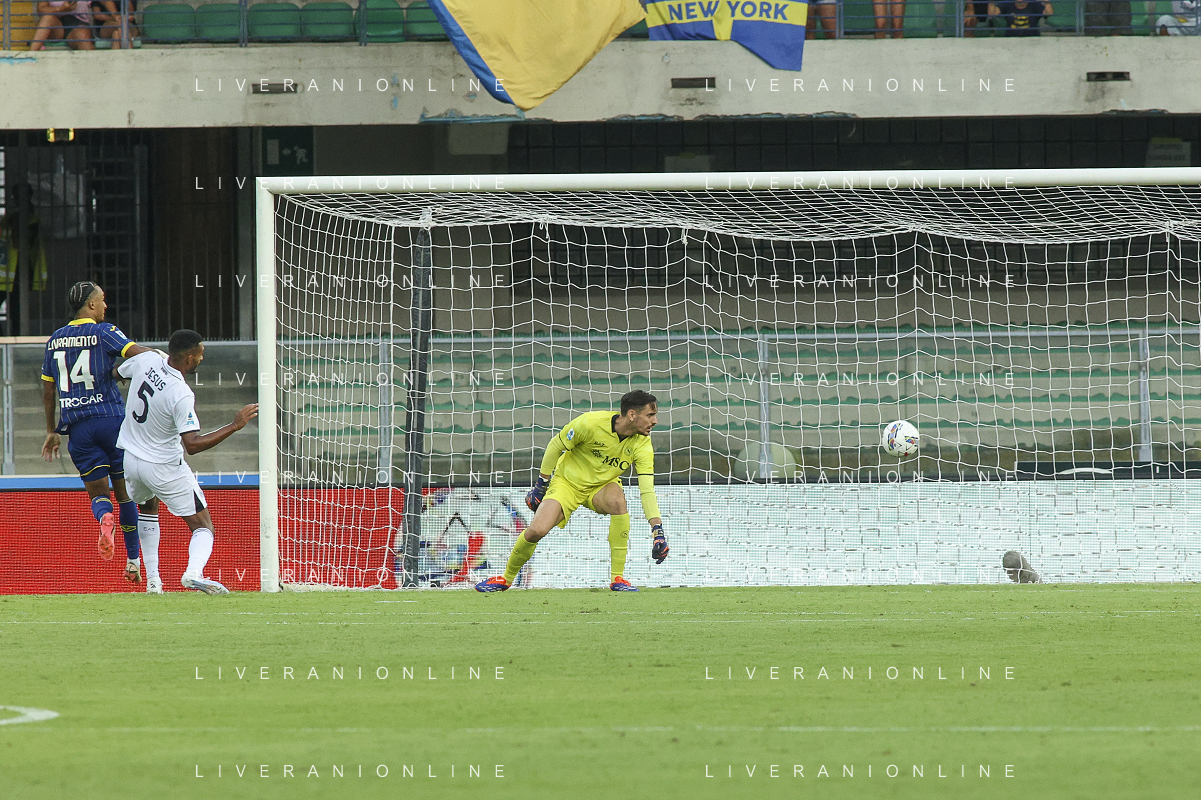 Daniel Mosquera of Hellas Verona FC scores a goal during Hellas Verona FC vs SSC Napoli, 1° Serie A EniLive 2024-25 game at Marcantonio Bentegodi Stadium in Verona (VR), Italy, on August 18, 2024. (Photo by Davide Casentini)/AGENZIA ALDO LIVERANI SAS