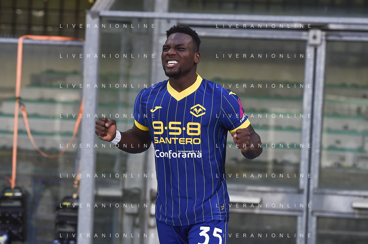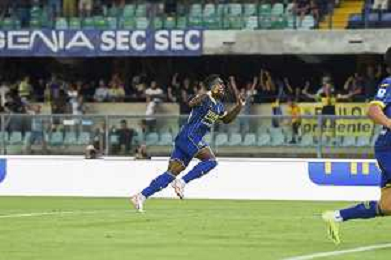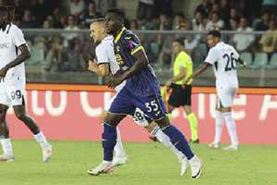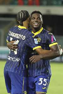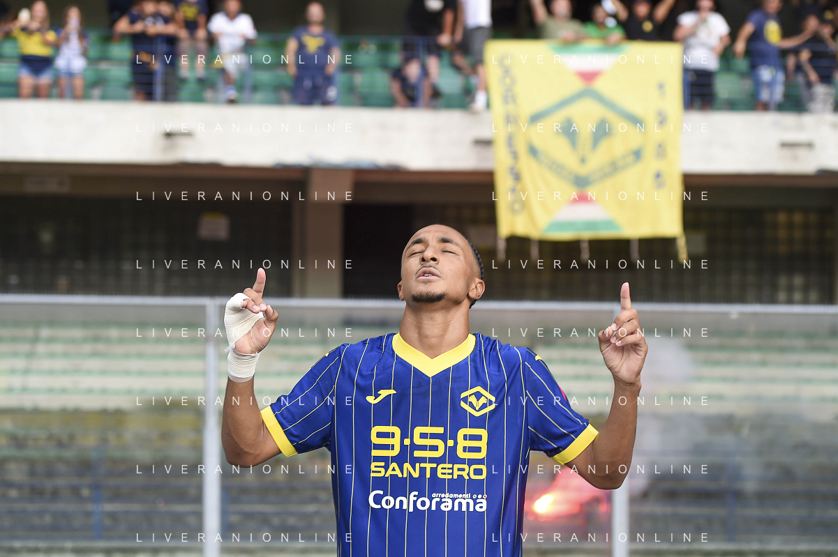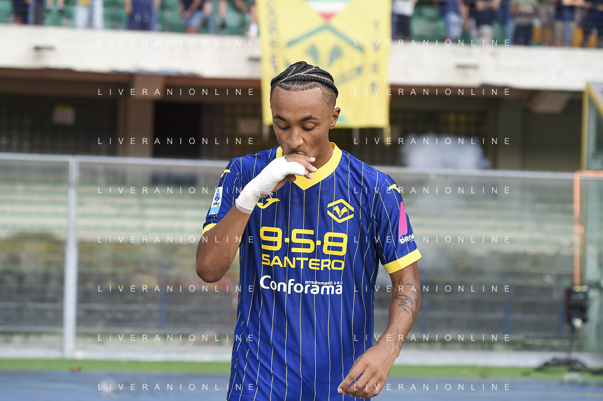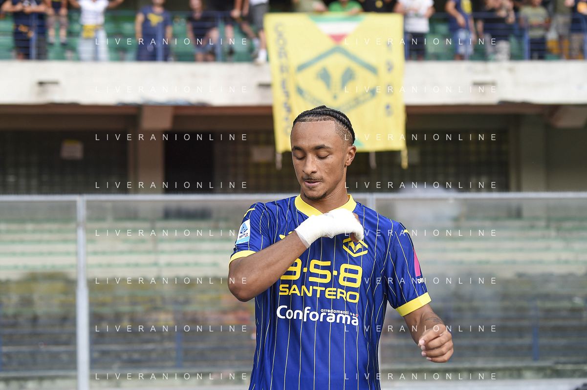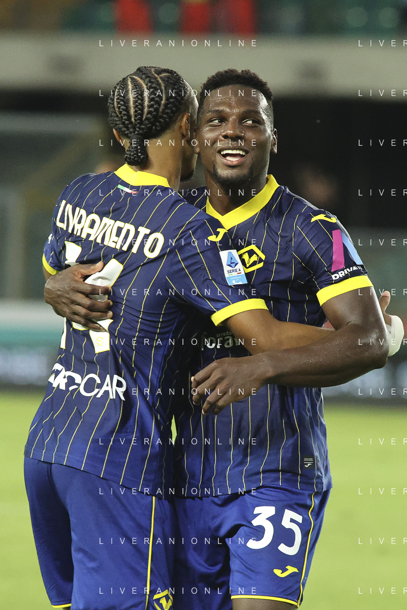 Dailon Livramento of Hellas Verona FC FC celebrates after scoring during Hellas Verona FC vs SSC Napoli, 1° Serie A EniLive 2024-25 game at Marcantonio Bentegodi Stadium in Verona (VR), Italy, on August 18, 2024. (Photo by Davide Casentini)/AGENZIA ALDO LIVERANI SAS