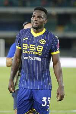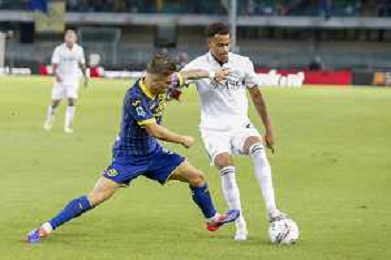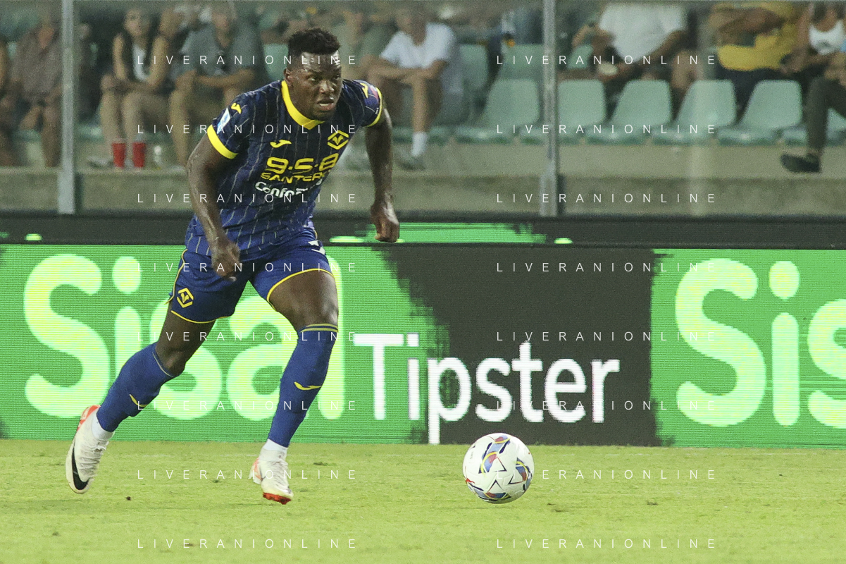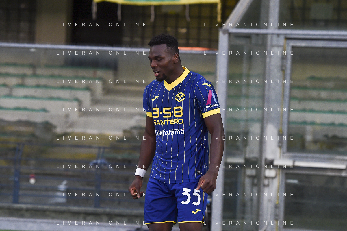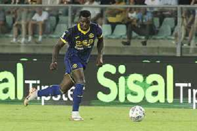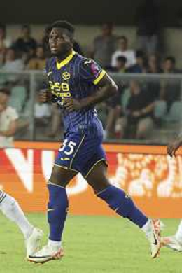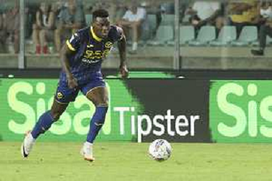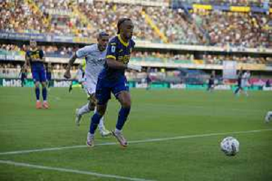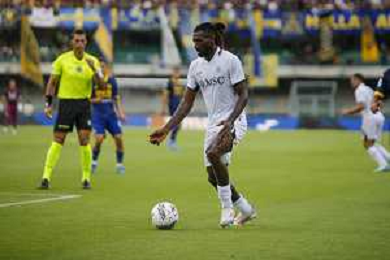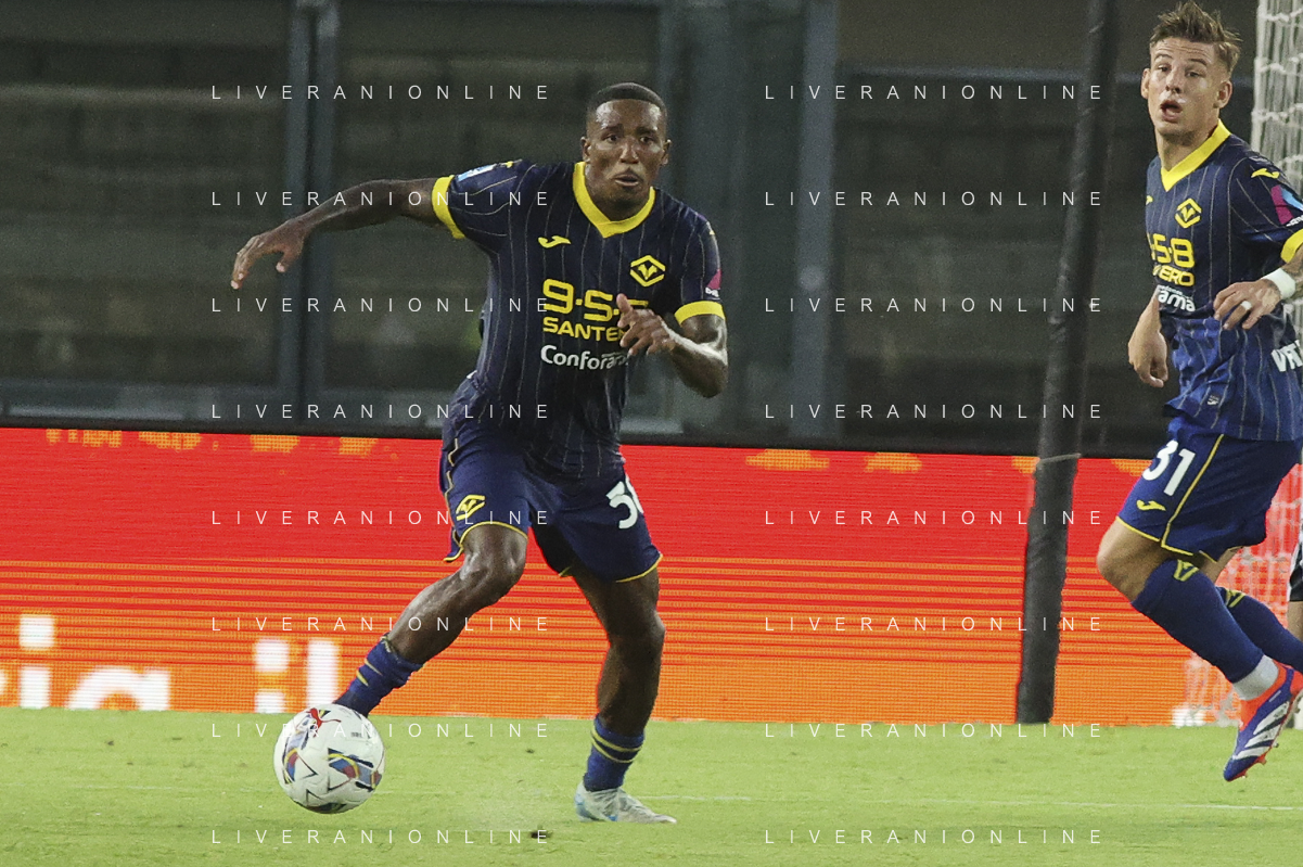 Jackson Tchatchoua of Hellas Verona FC play the ball during Hellas Verona FC vs SSC Napoli, 1° Serie A EniLive 2024-25 game at Marcantonio Bentegodi Stadium in Verona (VR), Italy, on August 18, 2024. (Photo by Davide Casentini)/AGENZIA ALDO LIVERANI SAS