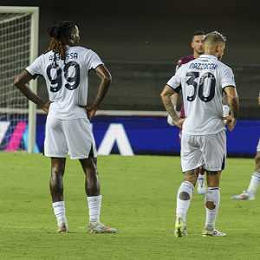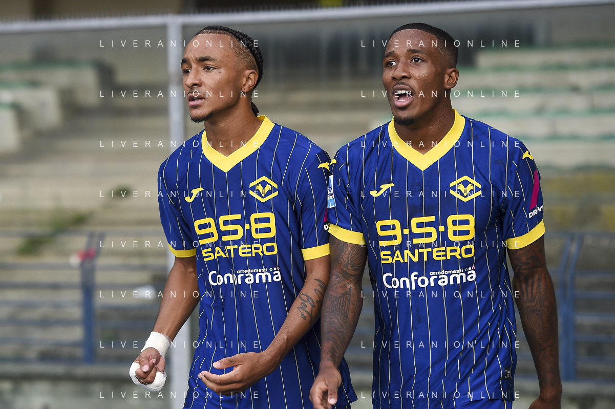 Dailon Livramento of Hellas Verona FC FC hugs Daniel Mosquera of Hellas Verona FC at the end of Hellas Verona FC vs SSC Napoli, 1° Serie A EniLive 2024-25 game at Marcantonio Bentegodi Stadium in Verona (VR), Italy, on August 18, 2024. (Photo by Davide Casentini)/AGENZIA ALDO LIVERANI SAS