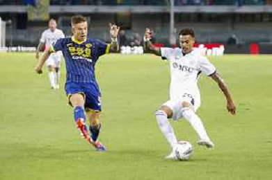 Andre'-Frank Zambo Anguissa of SSC Napoli, Masquale Mazzocchi of SSC Napoli expresses disappointment during Hellas Verona FC vs SSC Napoli, 1° Serie A EniLive 2024-25 game at Marcantonio Bentegodi Stadium in Verona (VR), Italy, on August 18, 2024. (Photo by Davide Casentini)/AGENZIA ALDO LIVERANI SAS