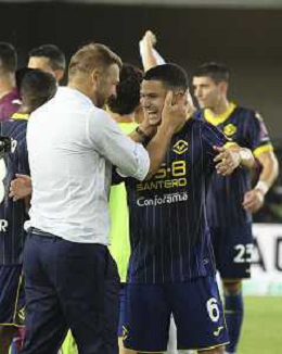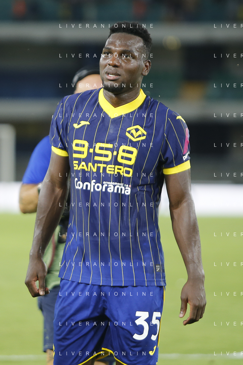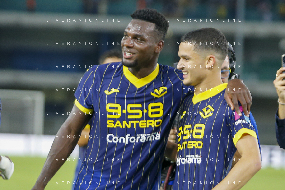 Daniel Mosquera of Hellas Verona FC celebrate the victory at the end of Hellas Verona FC vs SSC Napoli, 1° Serie A EniLive 2024-25 game at Marcantonio Bentegodi Stadium in Verona (VR), Italy, on August 18, 2024. (Photo by Davide Casentini)/AGENZIA ALDO LIVERANI SAS