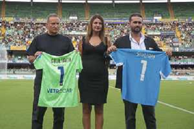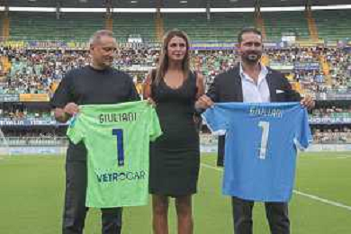 Il Presidente del Verona Maurizio Setti e il Vice Presidente Edoardo De Laurentiis con la maglia di Giuliano Giuliani, ex portiere di entrambe le due squadre consegnano alla figlia del portiere, Gessica, delle maglie personalizzate con il numero 1 - during Hellas Verona FC vs SSC Napoli, 1° Serie A EniLive 2024-25 game at Marcantonio Bentegodi Stadium in Verona (VR), Italy, on August 18, 2024. (Photo by Davide Casentini)/AGENZIA ALDO LIVERANI SAS
