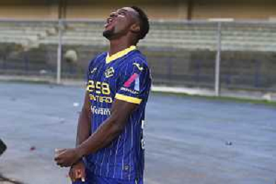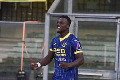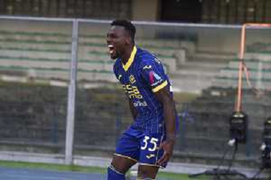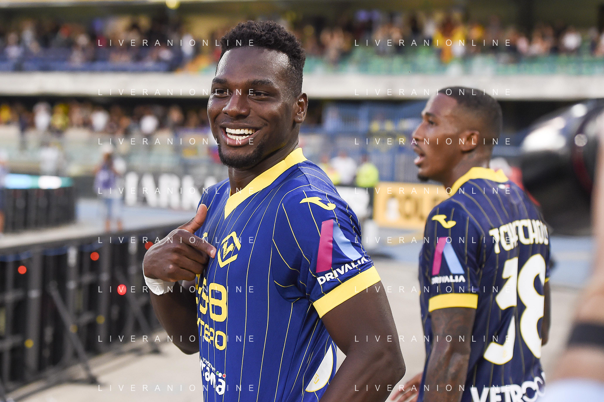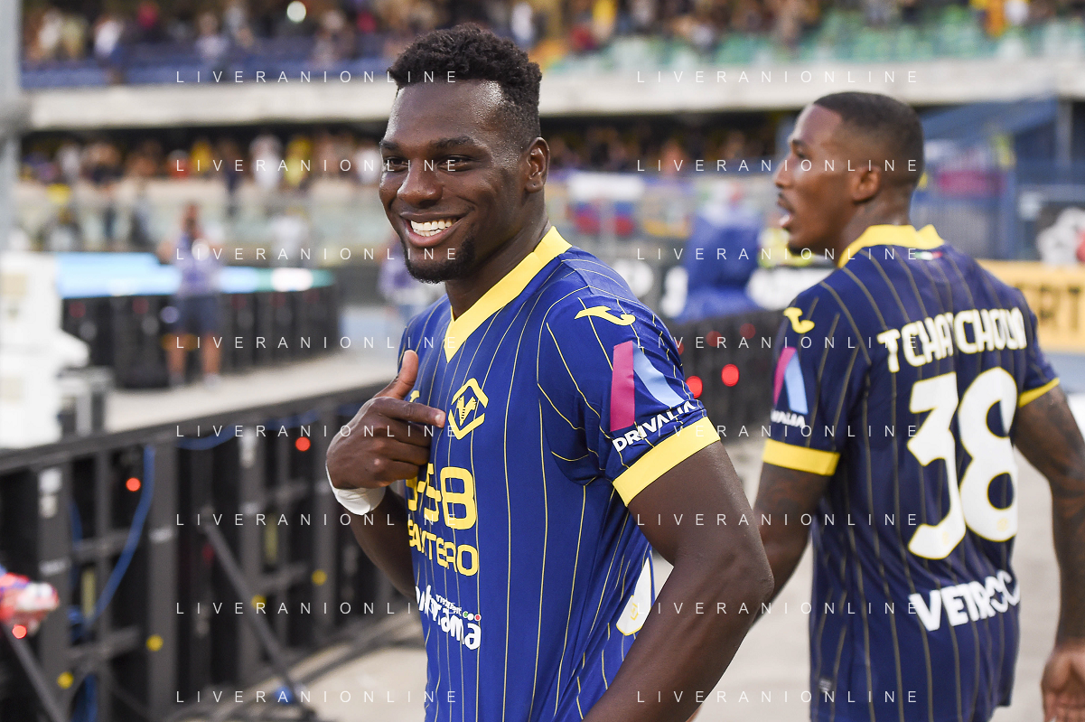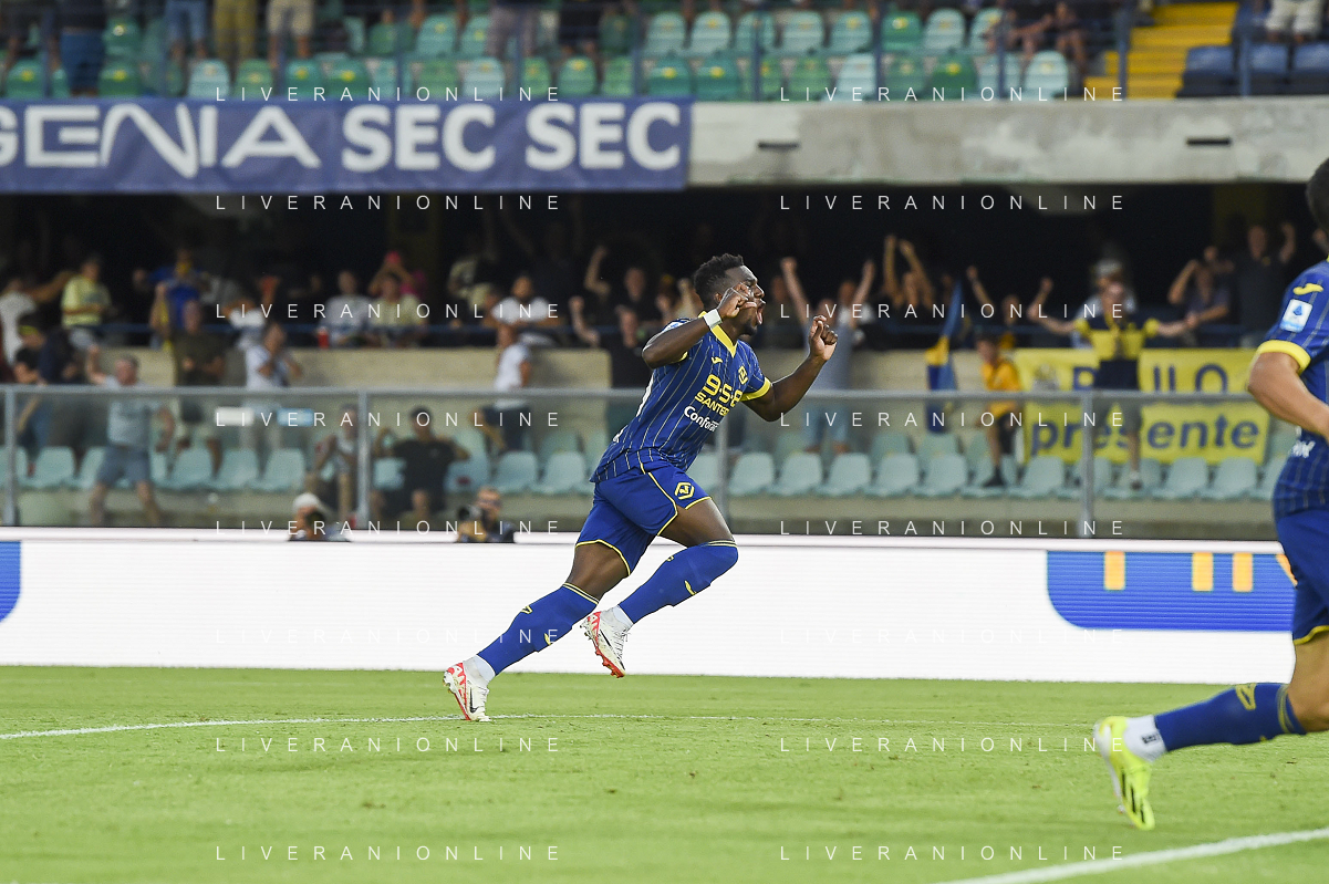 Daniel Mosquera of Hellas Verona FC celebrates after scoring during Hellas Verona FC vs SSC Napoli, 1° Serie A EniLive 2024-25 game at Marcantonio Bentegodi Stadium in Verona (VR), Italy, on August 18, 2024. (Photo by Davide Casentini)/AGENZIA ALDO LIVERANI SAS