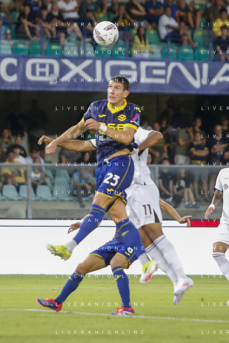 Giangiacomo Magnani of Hellas Verona FC heads the ball during Hellas Verona FC vs SSC Napoli, 1° Serie A EniLive 2024-25 game at Marcantonio Bentegodi Stadium in Verona (VR), Italy, on August 18, 2024. (Photo by Davide Casentini)/AGENZIA ALDO LIVERANI SAS