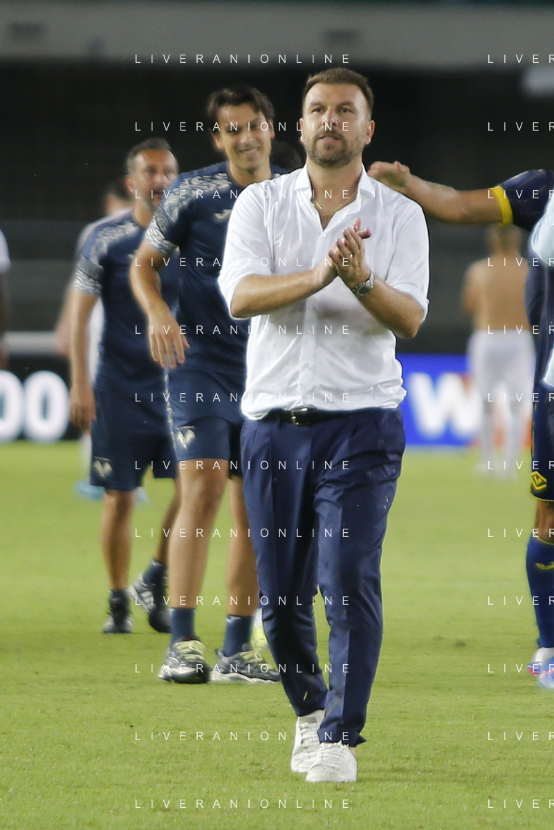 Paolo Zanetti Head Coach of Hellas Verona FC applaud the fans following the final whistle during Hellas Verona FC vs SSC Napoli, 1° Serie A EniLive 2024-25 game at Marcantonio Bentegodi Stadium in Verona (VR), Italy, on August 18, 2024. (Photo by Davide Casentini)/AGENZIA ALDO LIVERANI SAS