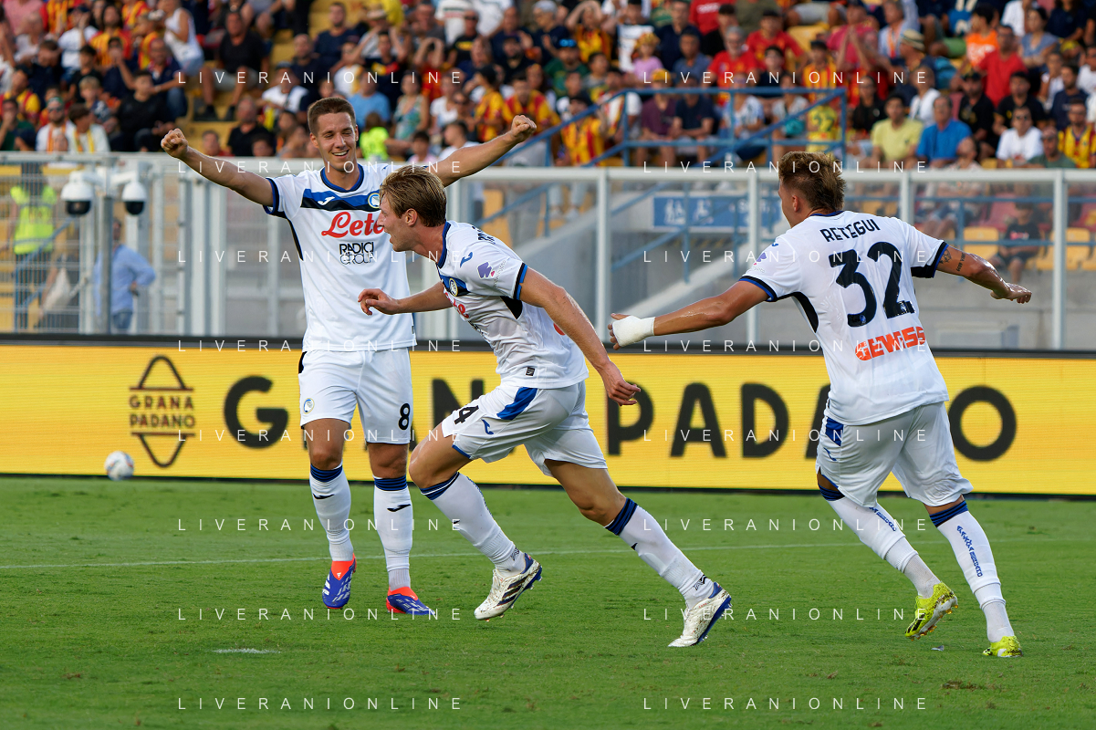 TVEM August 19, 2024 Lecce, Italy - US Lecce vs Atalanta - Italian soccer serie A 2024/25 - Via Del Mare Stadium. In the pic by Emmanuele Mastrodonato /AGENZIA ALDO LIVERANI SAS: Marco Brescianini of Atalanta celebrates after scoring a goal with Mario Pasalic and Mateo Retegui of Atalanta /AGENZIA ALDO LIVERANI SAS