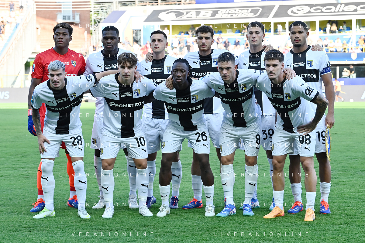 Parma vs Milan nella foto formazione Parma, in piedi da SX Zion Suzuki, Ange-Yoan Bonny, Emanuele Valeri, Botond Balogh, Alessandro Circati e Simon Sohm; in basso a SX Valentin Mihaila, Adrian Bernabe' Garcia, Woyo Coulibaly, Nahuel Estevez Alvarez e Dennis Man Parma 24-08-2024 Stadio Ennio Tardini Campionato Serie A Enilive - 2a giornata foto Roberto Garavaglia/Agenzia Aldo Liverani sas