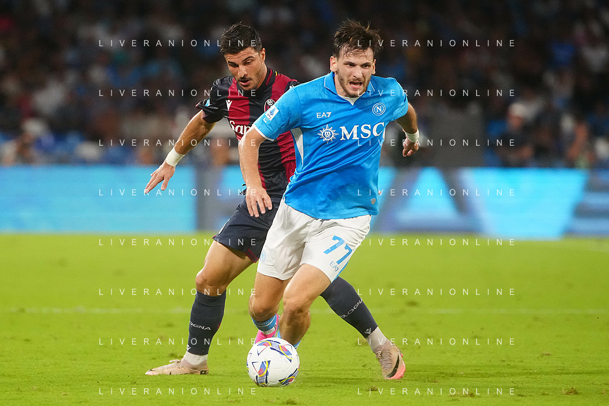 NAPOLI - BOLOGNA 2a giornata Campionato Calcio Serie A Enilive 25.08.2024 Nella Foto: Stefan Posch, Khvicha Kvaratskhelia ©MOSCA/AGENZIA ALDO LIVERANI SAS