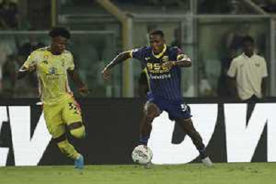Jackson Tchatchoua of Hellas Verona FC battle for the ball with Samuel Mbangula of Juventus FC during Hellas Verona FC vs Juventus FC, 2° Serie A Enilive 2024-25 game at Marcantonio Bentegodi Stadium in Verona (VR), Italy, on August 26, 2024. (Photo by Davide Casentini)/ AGENZIA ALDO LIVERANI SAS