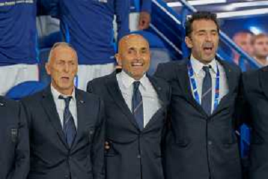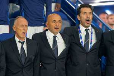 TVEM September 6, 2024 in Paris, France. France vs Italy, UEFA Nations League 2024/25 League A Group A2 match - Parc des Princes Stadium. In the pic: coach of Italy Marco Domenichini, Luciano Spalletti head coach of Italy and Italy Head of Delegation Gianluigi Buffon during the National Anthems/AGENZIA ALDO LIVERANI SAS
