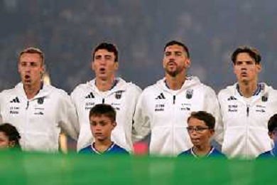 TVEM September 6, 2024 in Paris, France. France vs Italy, UEFA Nations League 2024/25 League A Group A2 match - Parc des Princes Stadium. In the pic: Davide Frattesi, Andrea Cambiaso, Lorenzo Pellegrini and Samuele Ricci of Italy line up during the National Anthems/AGENZIA ALDO LIVERANI SAS