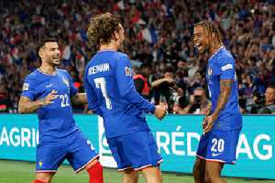 TVEM September 6, 2024 in Paris, France. France vs Italy, UEFA Nations League 2024/25 League A Group A2 match - Parc des Princes Stadium. In the pic: Bradley Barcola of France celebrates after scoring a goal with Antoine Griezmann of France and Theo Hernández of France/AGENZIA ALDO LIVERANI SAS