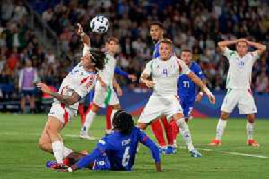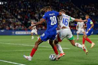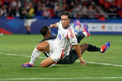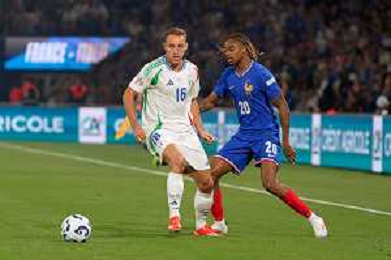 TVEM September 6, 2024 in Paris, France. France vs Italy, UEFA Nations League 2024/25 League A Group A2 match - Parc des Princes Stadium. In the pic: Bradley Barcola of France in action against Davide Frattesi of Italy/AGENZIA ALDO LIVERANI SAS