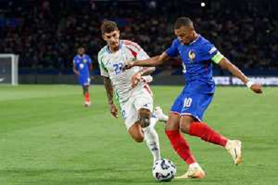 TVEM September 6, 2024 in Paris, France. France vs Italy, UEFA Nations League 2024/25 League A Group A2 match - Parc des Princes Stadium. In the pic: Kylian Mbappe’ of France in action against Federico dimarco of Italy/AGENZIA ALDO LIVERANI SAS