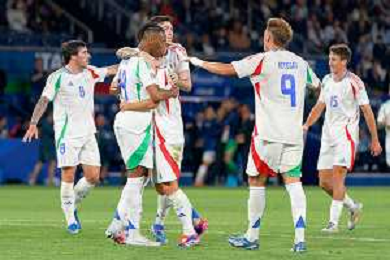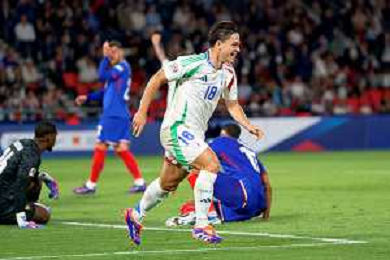 TVEM September 6, 2024 in Paris, France. France vs Italy, UEFA Nations League 2024/25 League A Group A2 match - Parc des Princes Stadium. In the pic: Giacomo Raspadori of Italy celebrates after scoring a goal with teammates/AGENZIA ALDO LIVERANI SAS