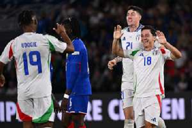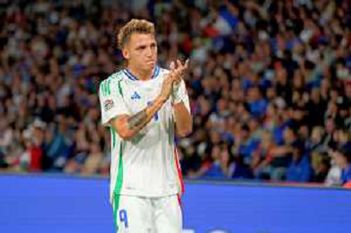 TVEM September 6, 2024 in Paris, France. France vs Italy, UEFA Nations League 2024/25 League A Group A2 match - Parc des Princes Stadium. In the pic: Giacomo Raspadori of Italy celebrates after scoring a goal with teammates ©Emanuele Mastrodonato/AGENZIA ALDO LIVERANI SAS
