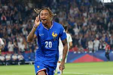TVEM September 6, 2024 in Paris, France. France vs Italy, UEFA Nations League 2024/25 League A Group A2 match - Parc des Princes Stadium. In the pic: Bradley Barcola of France celebrates after scoring a goal ©Emanuele Mastrodonato/AGENZIA ALDO LIVERANI SAS