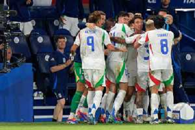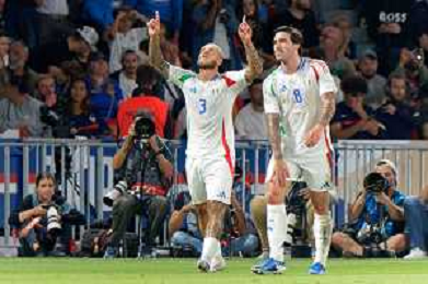 TVEM September 6, 2024 in Paris, France. France vs Italy, UEFA Nations League 2024/25 League A Group A2 match - Parc des Princes Stadium. In the pic: Federico Dimarco of Italy celebrates after scoring a goal with teammates ©Emanuele Mastrodonato/AGENZIA ALDO LIVERANI SAS