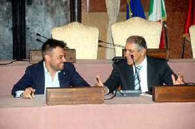 IMOLA 09 09 2024 DIFFUSIONE SPORT PALLAVOLO CONFERENZA STAMPA TROFEO MC DONALD'S 2024 TORNEO DI SERE A VOLLEY FEMMINILE NELLA FOTO DA DESTRA PASQUALE DE SIMONE,SINDACO MARCO PANIERI ©SANNA- AGENZIA ALDO LIVERANI SAS