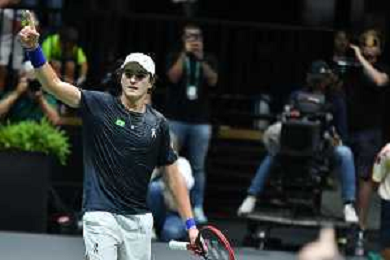 BOLOGNA, 12 Settembre 2024: Joao Fonseca festeggia la vittoria in Davis Cup Finals Group Stage Bologna nel match contro l'Olanda all'Unipol Arena di Bologna foto andrea rosito-ag aldo liverani sas