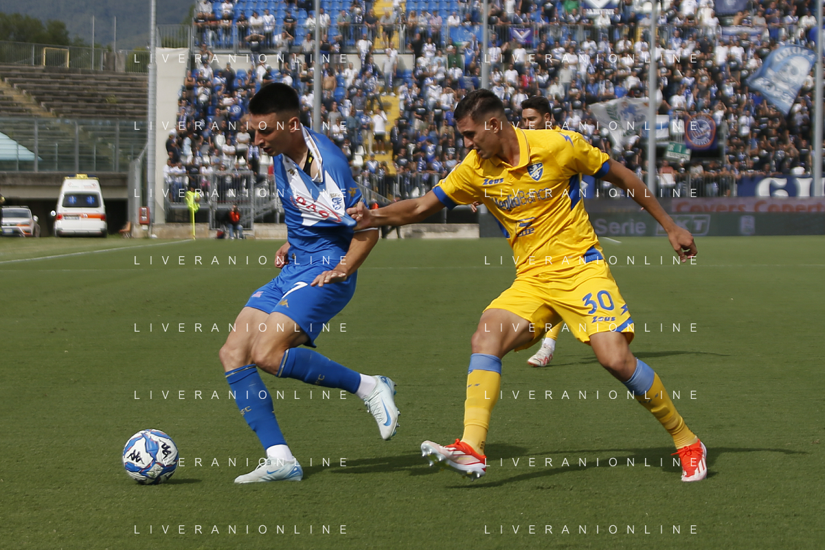 Ante Matej Juric of Brescia Calcio FC contrasto Ilario Monterisi of Frosinone Calcio during Brescia Calcio vs Frosinone Calcio, 5° Serie B BKT 2024-25 game at Mario Rigamonti stadium in Brescia (BS), Italy, on September 14, 2024. (Photo by Davide Casentini) ag aldo liverai sas