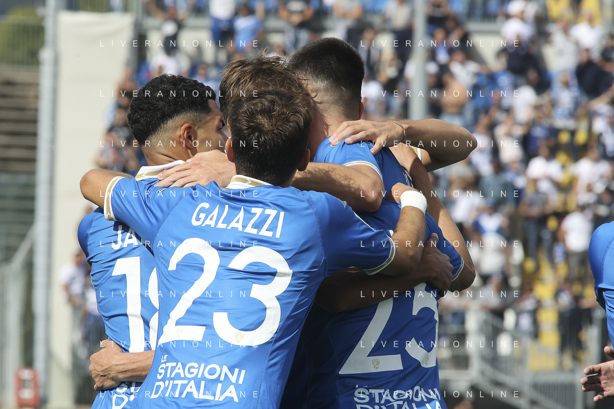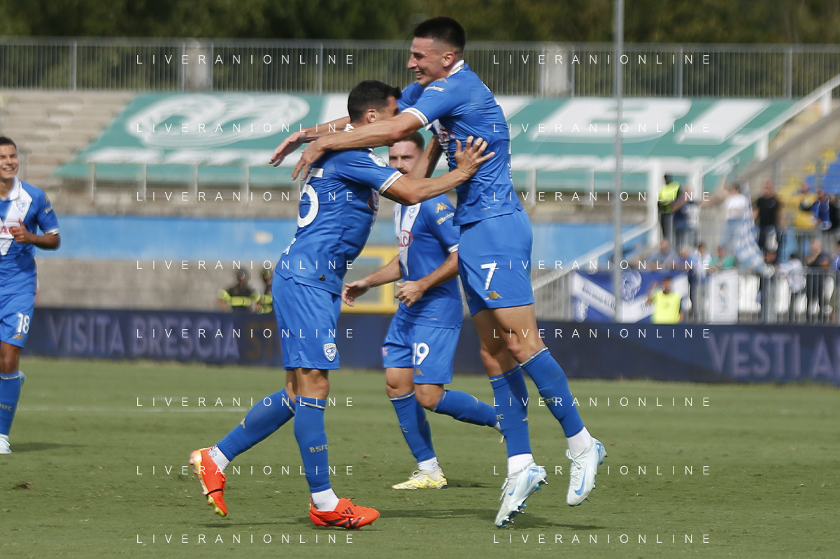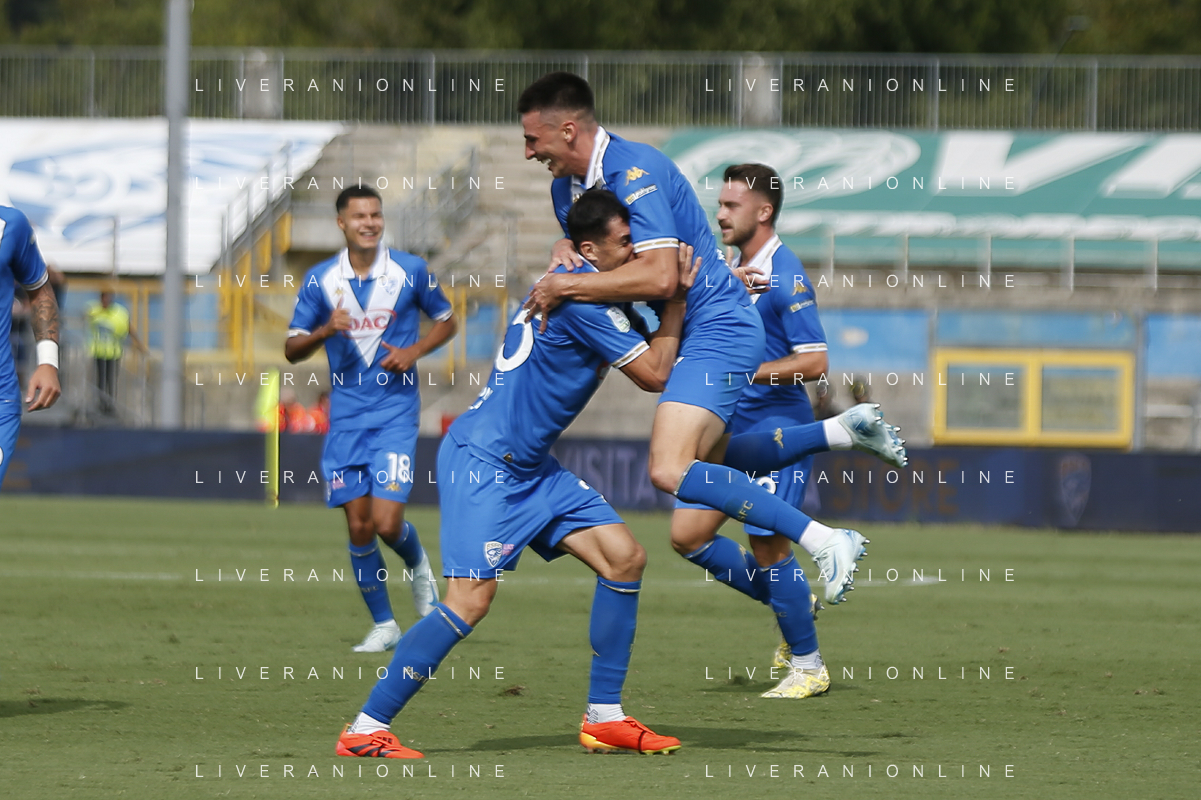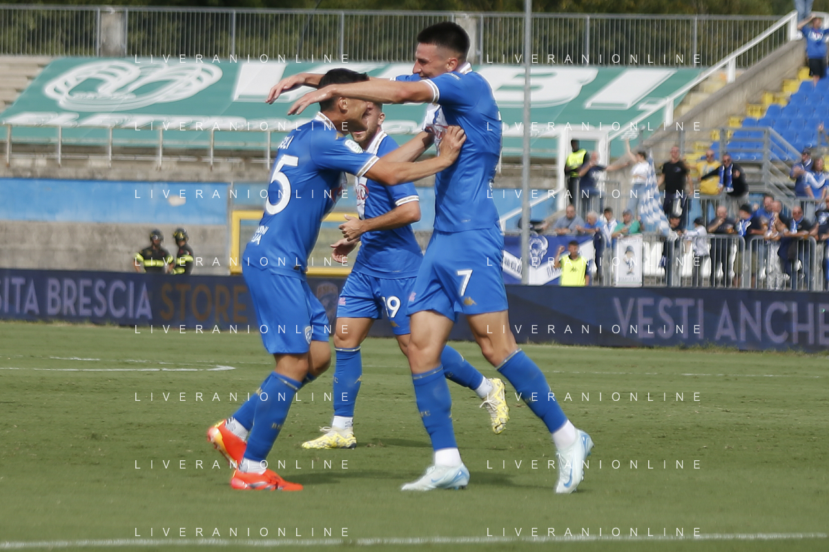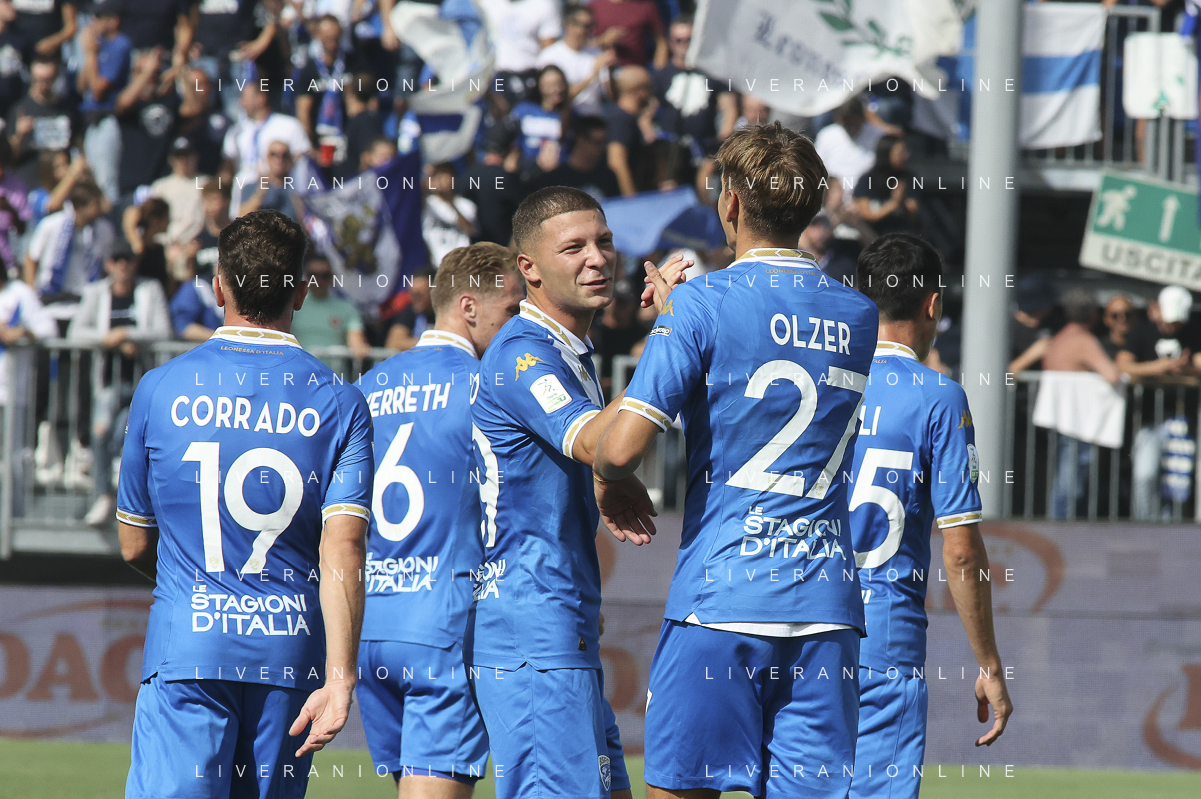 Giacomo Olzer of Brescia Calcio FC and Brescia players jubilates after scoring the goal during Brescia Calcio vs Frosinone Calcio, 5° Serie B BKT 2024-25 game at Mario Rigamonti stadium in Brescia (BS), Italy, on September 14, 2024. (Photo by Davide Casentini) ag aldo liverai sas